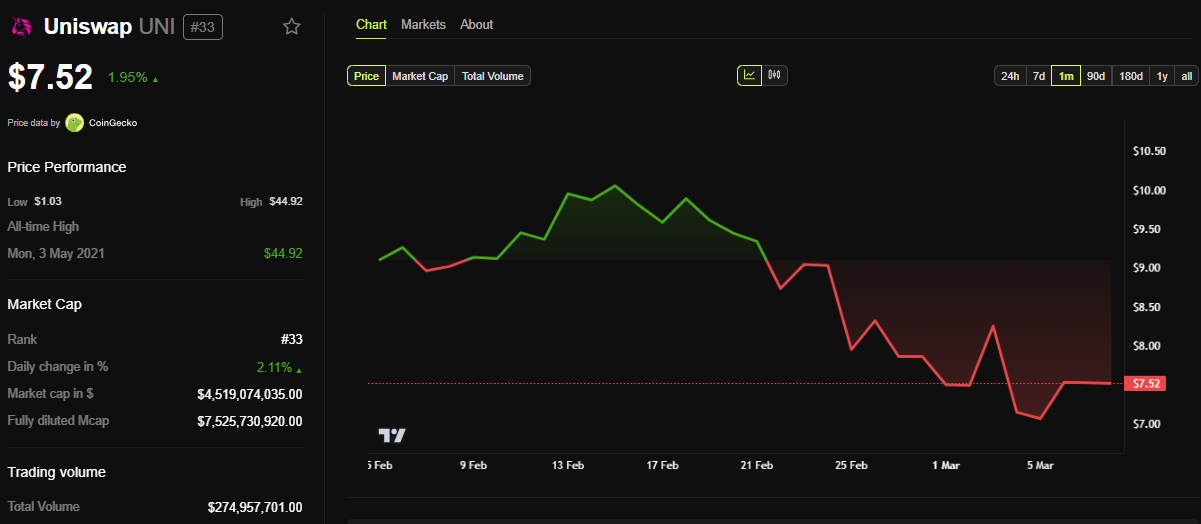 しかし、ユニチェーンL2が2月11日にメインネットで立ち上げられて以来、ユニスワップトークンの価格は下落している。本稿執筆時点で、UNIは7.52ドルで取引されており、木曜日のセッションが始まってからわずか2%上昇している。