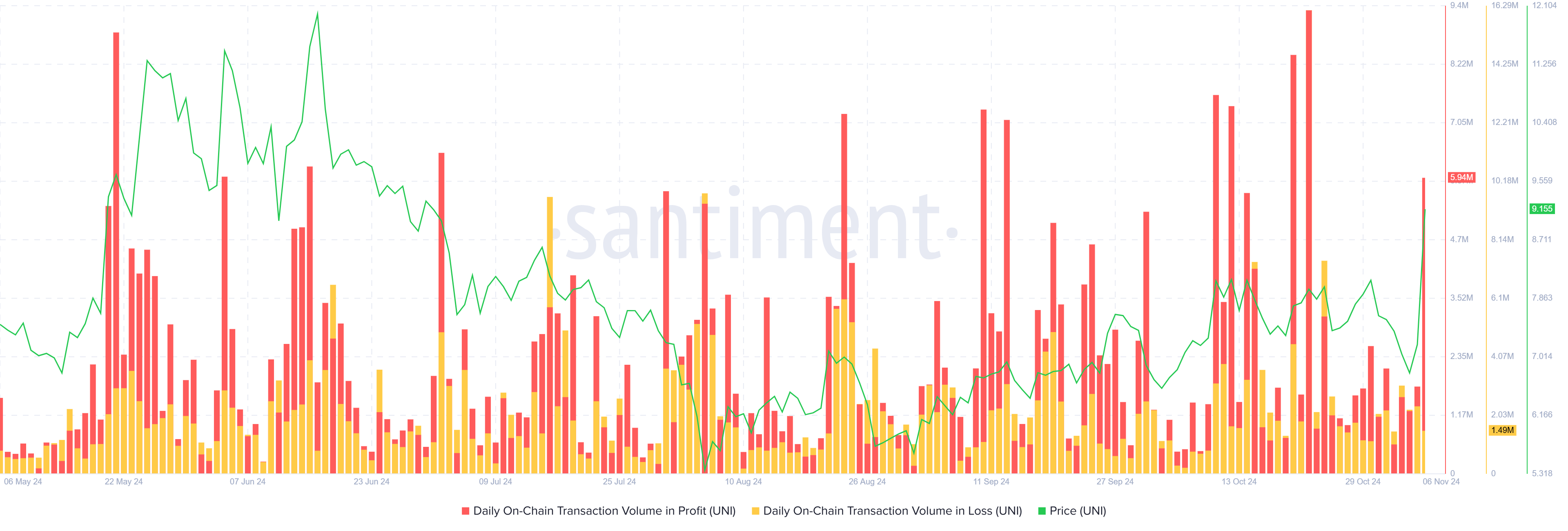 Uniswapの市場センチメントは、日々のオンチェーン取引の大部分が利益を報告していることから、励みになる兆候を示しています。このバランスは、強い上昇動向が長期間見られない中でも、投資家が大きな下落に直面していないことを示しています。一貫して利益を出す取引が投資家のセンチメントを肯定的に保ち、Uniswapの流動性を支える取引活動を促しています。