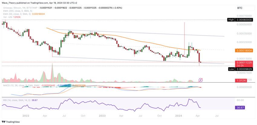Uniswapが上昇を開始する場合、0.00018 BTC付近の50週EMAで大きな抵抗に直面するだろう。