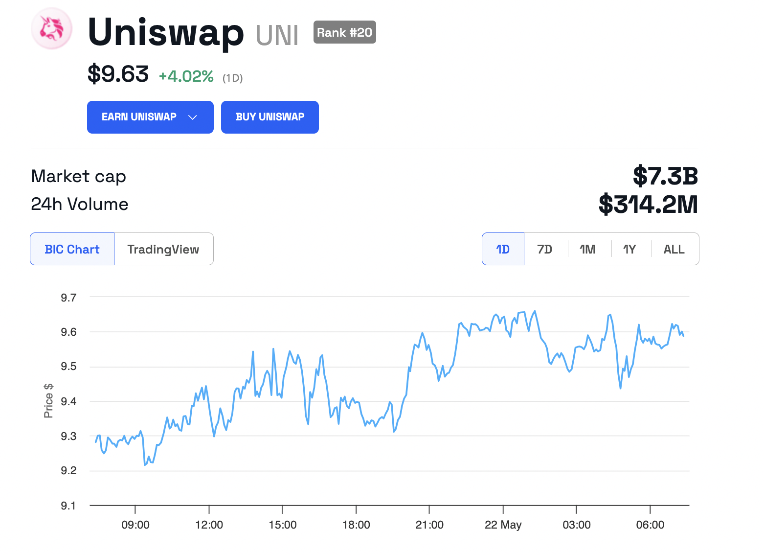 こうした動きを受けて、UniswapのUNIトークンは過去24時間で4%の値上がりを見せ、9.63ドルで取引された。