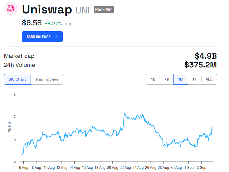 最新の動向の中で、Uniswap(UNI)トークンは8%上昇しています。 BeInCrypto のデータ によると、執筆時点では6.58ドルで取引されています。