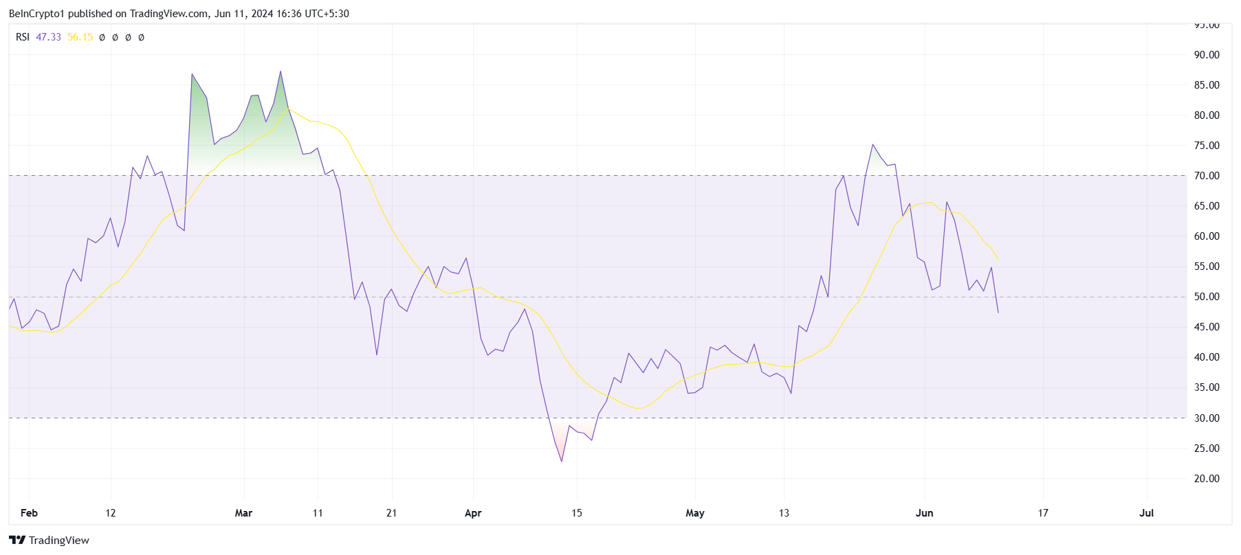 しかし、相対力指数(RSI)が示すように、このアルトコインはさらに下落する可能性がある。RSIは値動きの速さと変化を測定するモメンタムオシレーターで、0から100の範囲で表示される。相場の買われすぎや売られすぎを識別するのに役立ち、反転の可能性を示す。