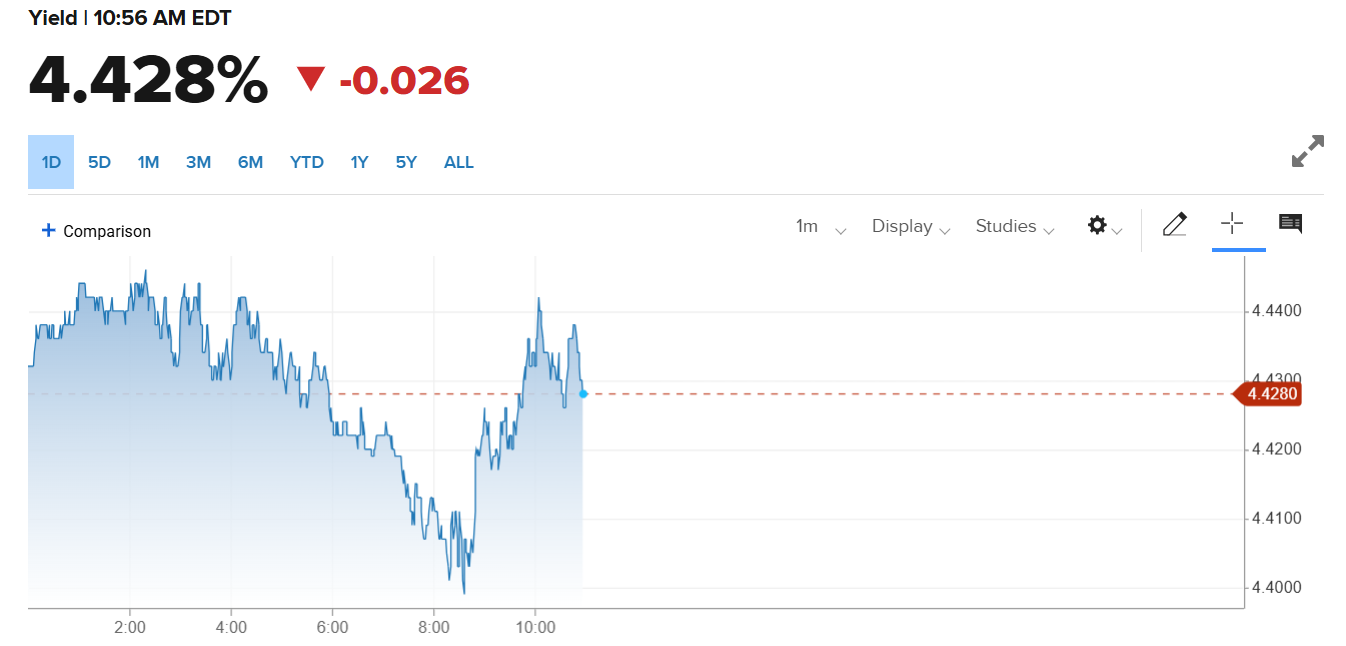 米国債利回りは広範な金融市場とともに下落している。基準となる10年物米国債の利回りは3ベーシスポイント(bps)下がり4.424%。一方、2年物米国債の利回りは1bps以上下がり3.958%となった。