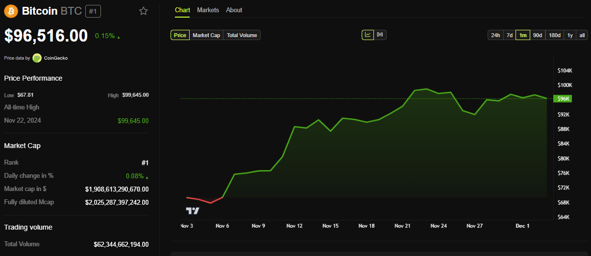 これらの米国経済データを前に、BTCはこの記事執筆時点で96,516ドルで取引されている。月曜日のセッション開始以来、0.15%の小幅な上昇である。