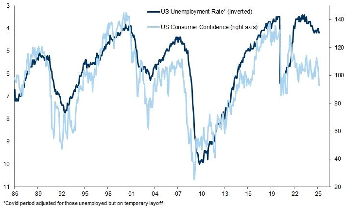 “ソフトデータはハードデータが下落することを示唆している。消費者信頼感は失業率(逆転)を先導する可能性がある。今回もそうであれば、約6%以上を見込んでいる”とMarkets and Mayhemが書いた。