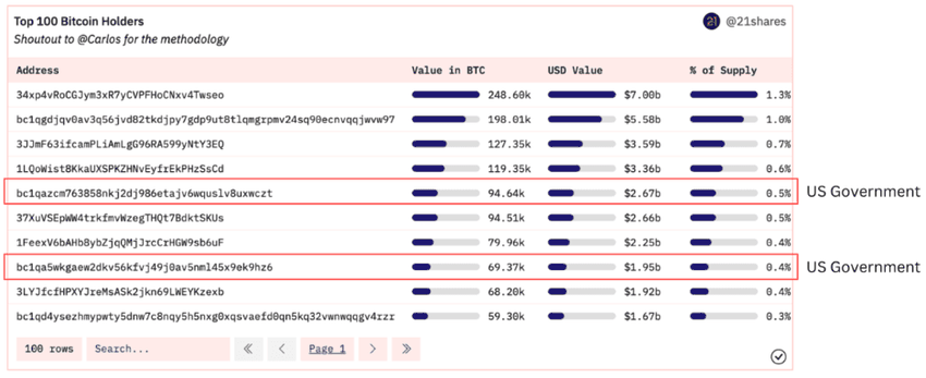 現在、米国政府が所有するビットコイン流通量の約1.06%相当の205,515ビットコインは2つのウォレットによって分散されており、両ウォレットはともに保有量上位10ウォレットに入っている。これらの情報は21Sharesが暗号資産分析サイトのDuneに掲載されている。