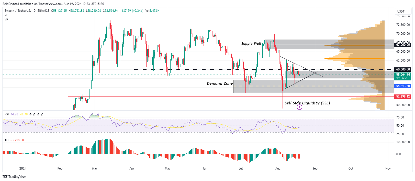 逆に、上方のトレンドラインを上抜けして終値がつくと、買い注文が増える可能性がある。出来高プロファイルのオレンジ色のスパイクに基づくと、6万3,000ドル以上のBTC価格では、複数の強気勢が対話を待っている。このレベルを上回る買い圧力は、上昇の可能性を活性化させる可能性がある。