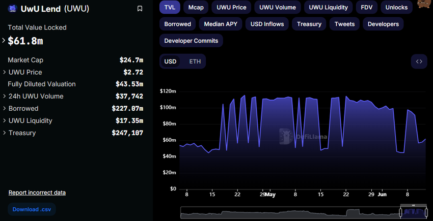 このような懸念は投資家にも届いており、DefiLlamaのデータでは今週、Total Value Locked (TVL)が28%下落した。UwU LendのTVLは、6月10日(月)の9,105万ドルから、報道時点では6,580万ドルに減少している。TVLの減少は、DeFiプロトコルにロックまたは預託された資産の総額の減少を示す。