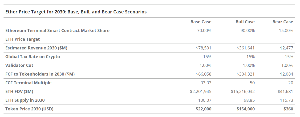 Sponsored「この金融システムの中心的な資産はETHトークンであり、我々の更新したベースケースでは、2030年までに22,000ドルの価値があり、今日のETH価格から487%、37.8%の複合年間成長率(CAGR)のトータルリターンに相当すると考えている」と同社は述べている。