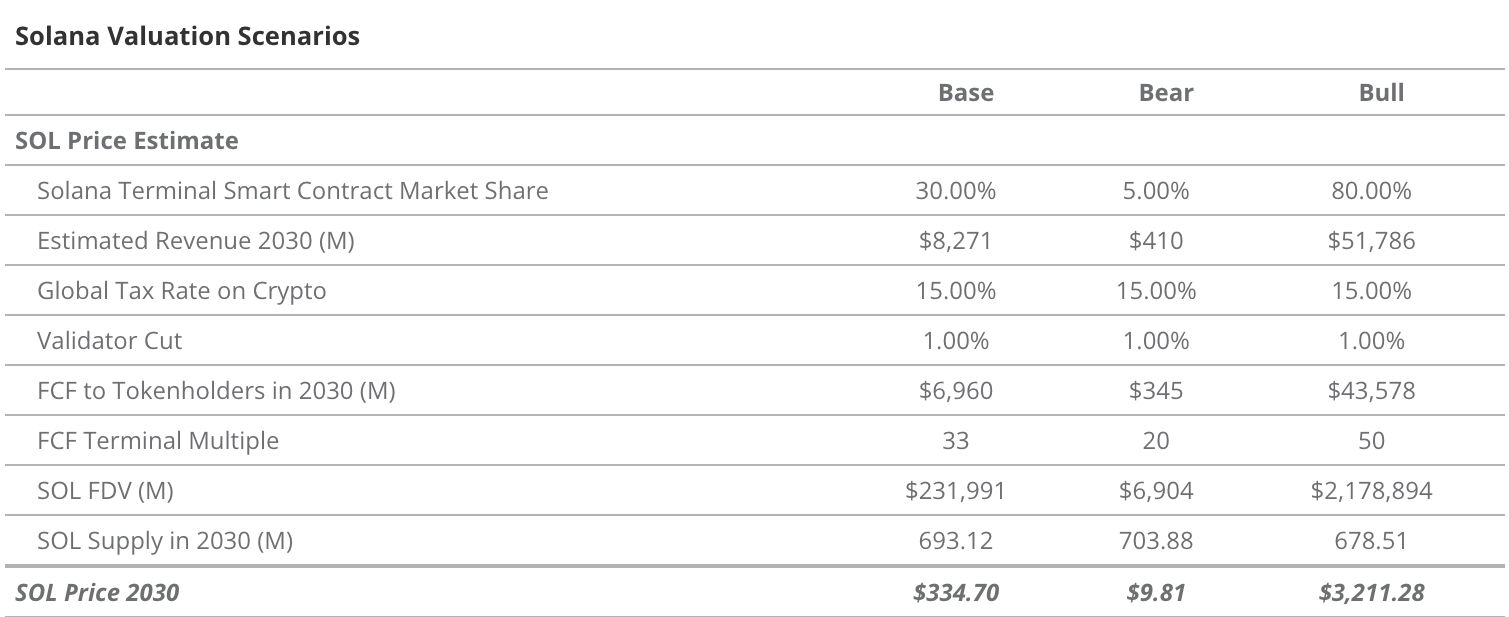 ソラナは強気シナリオの場合、30年に3211.28ドルまで急騰する可能性がある。ソラナベースの分散型アプリケーション(DApps)に関し、利用ユーザー数1億人に達することが条件。同通貨の投資リターンは市場全体で80億ドルに達する可能性も。一方で、30年におけるソラナ・ブロックチェーンの収益性に関しては、イーサリアム(Ethereum)と比較して20%の利益率および半分以下の市場シェアに留まるとも予測。