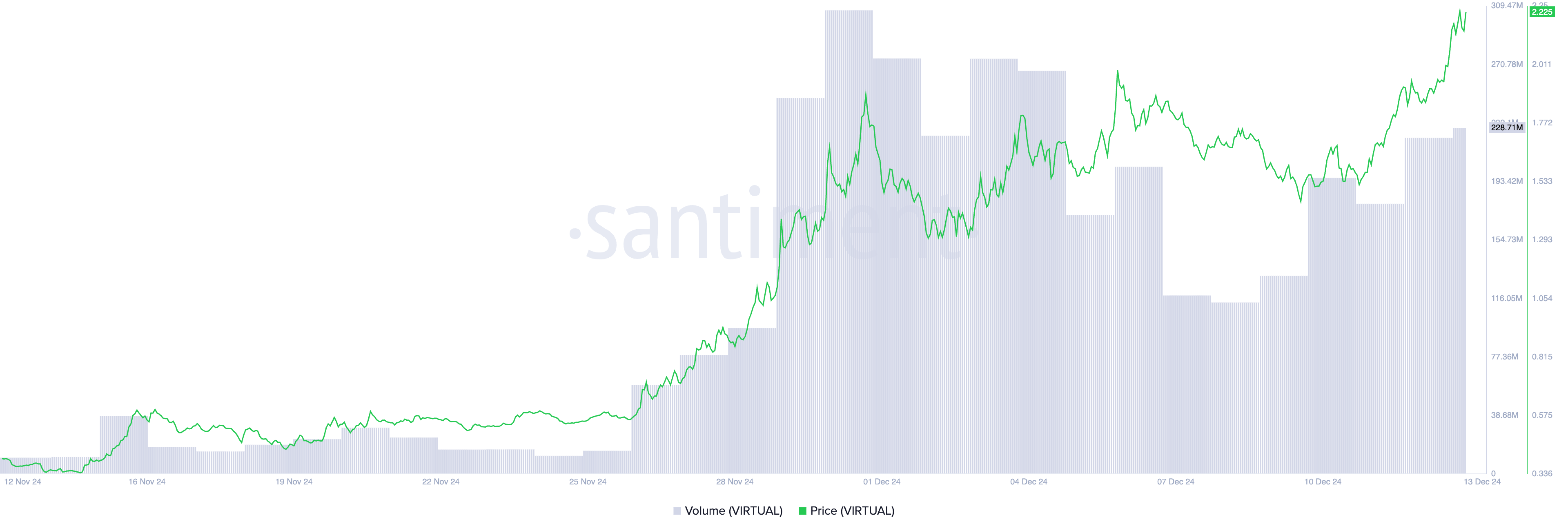 VIRTUALの2桁の上昇は、取引活動の急増と一致しており、取引量は2億2871万ドルに達し、24時間で13%増加した。
