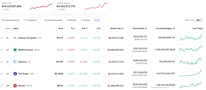 Render (RNDR)もまた、前年比1,100%の上昇を記録し、暗号資産市場のトップ50入りを果たし話題となった。現在、史上最高値に近い価格で取引されているRNDRは、AIトークンが新たなマイルストーンを達成する可能性を例証している。