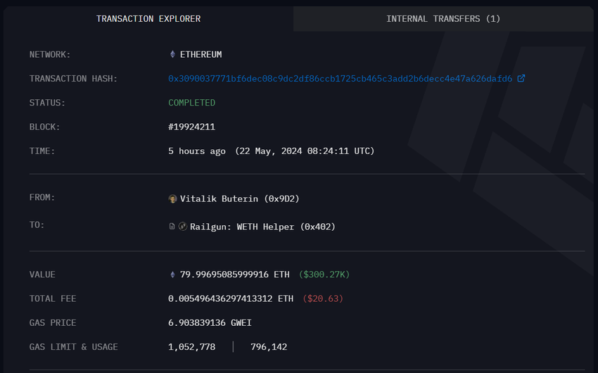 Arkham Intelligenceのデータによると、イーサリアムの共同創設者であるヴィタリック・ブテリン氏が22日、80ETHをプライバシー重視のRailgunに送金したことが明らかになった。今日の価格では、ブテリンの送金額はおよそ$300,000に相当する。