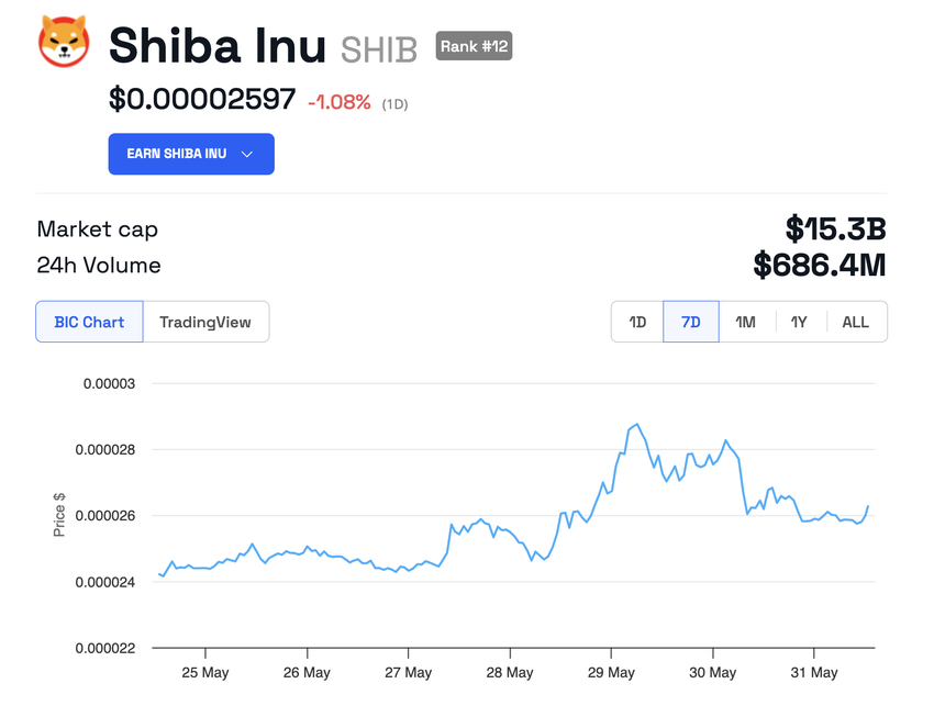 しかし、過去24時間で、Shiba Inuは約1%下落し、現在0.00002597ドルで取引されている。