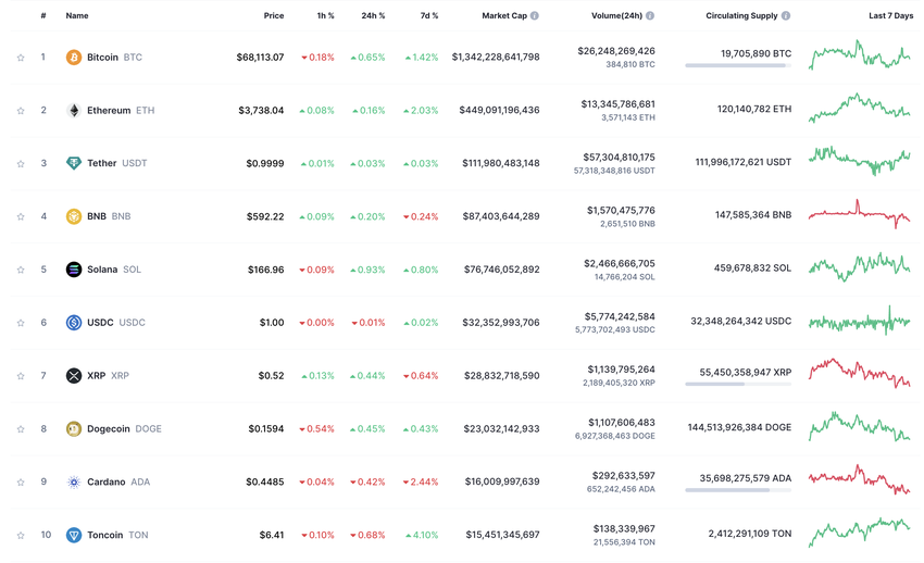 今週の暗号ラウンドアップの最後に、市場では上位暗号資産の間で様々なパフォーマンスが見られた。BitcoinとEthereumは小幅な上昇を見せたが、Toncoin (TON)は4%の上昇を記録し、上位暗号資産の中で最も高い上昇を記録した。