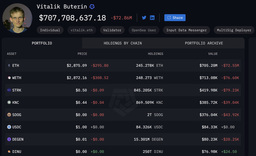 イーサリアムの共同創設者であるVitalik Buterin氏は、主にイーサリアムの保有と戦略的投資により、公開ポートフォリオが7億770万ドルに増加しました。市場のボラティリティにもかかわらず、ブテリンの財務状況は、イーサリアムのエコシステム内での彼の基礎的な役割を反映して、堅実なままである。