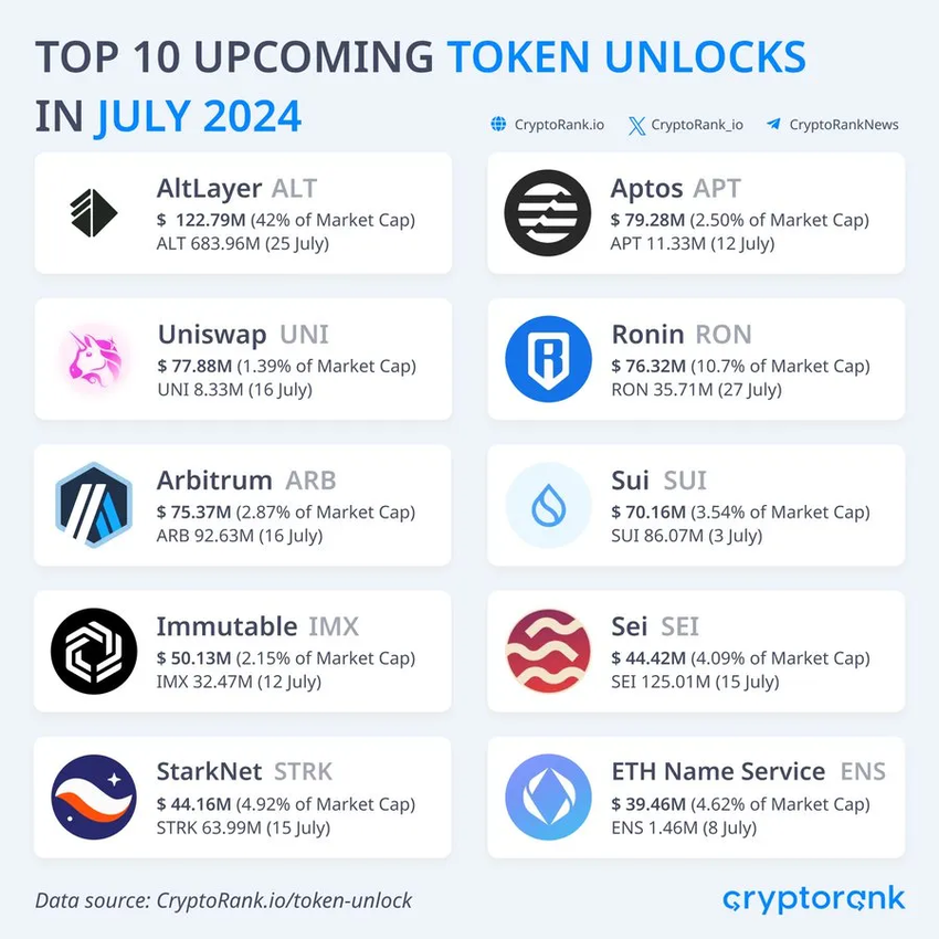 中でも重要なのはアルトレイヤー(ALT)で、7月25日に約1億1900万ドル相当のトークンをリリースする。これは時価総額の約22%に相当する。