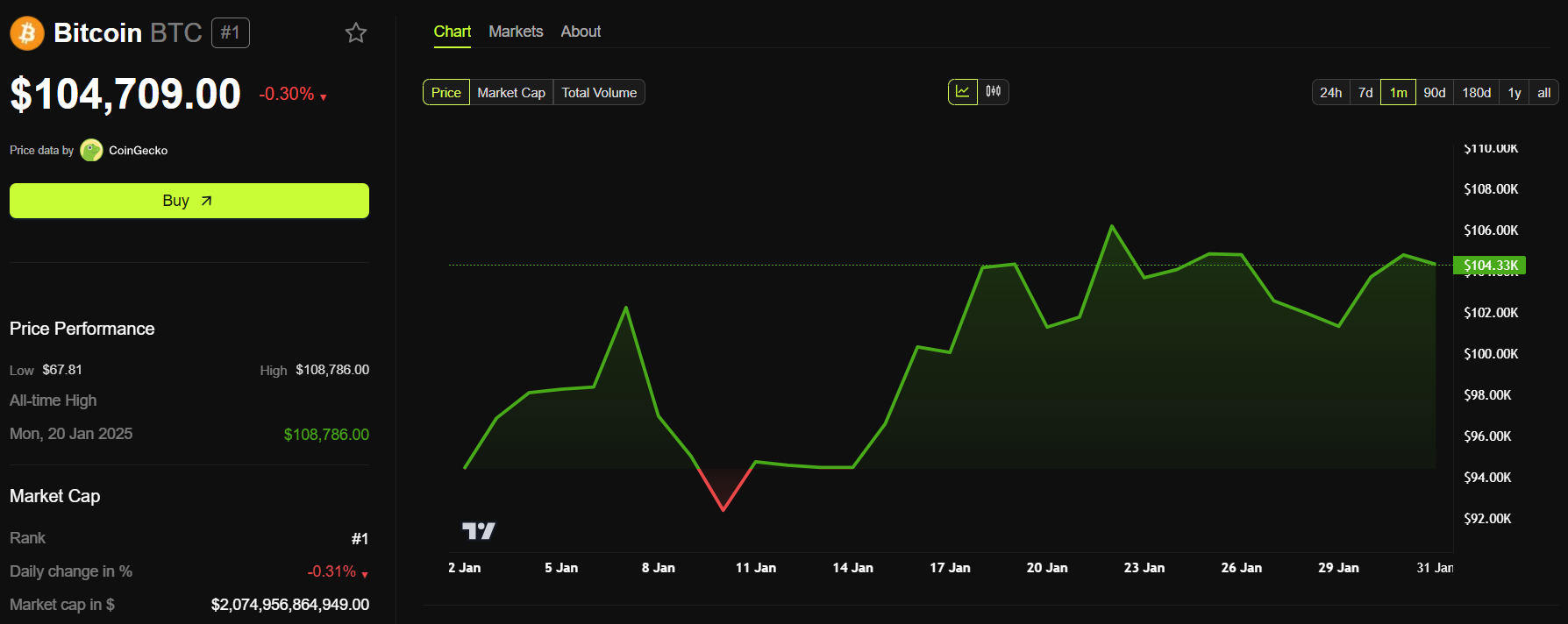 ヘイズは、ビットコインが世界的な流動性条件の変化に特に敏感であり、予測された下落につながる可能性があると主張した。本稿執筆時点で、ビットコインは104709ドルで取引されており、過去24時間で0.3%下落している。