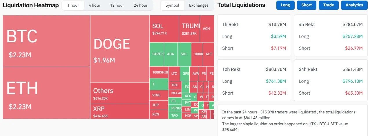 DeepSeekの台頭により、ビットコイン(BTC)は数時間で5%以上下落し、主要なアルトコインは8〜10%のさらに急激な下落を見せた。Coinglassのデータによれば、1月27日に24時間で315090人のトレーダーが清算され、総清算額は8億ドルを超えた。