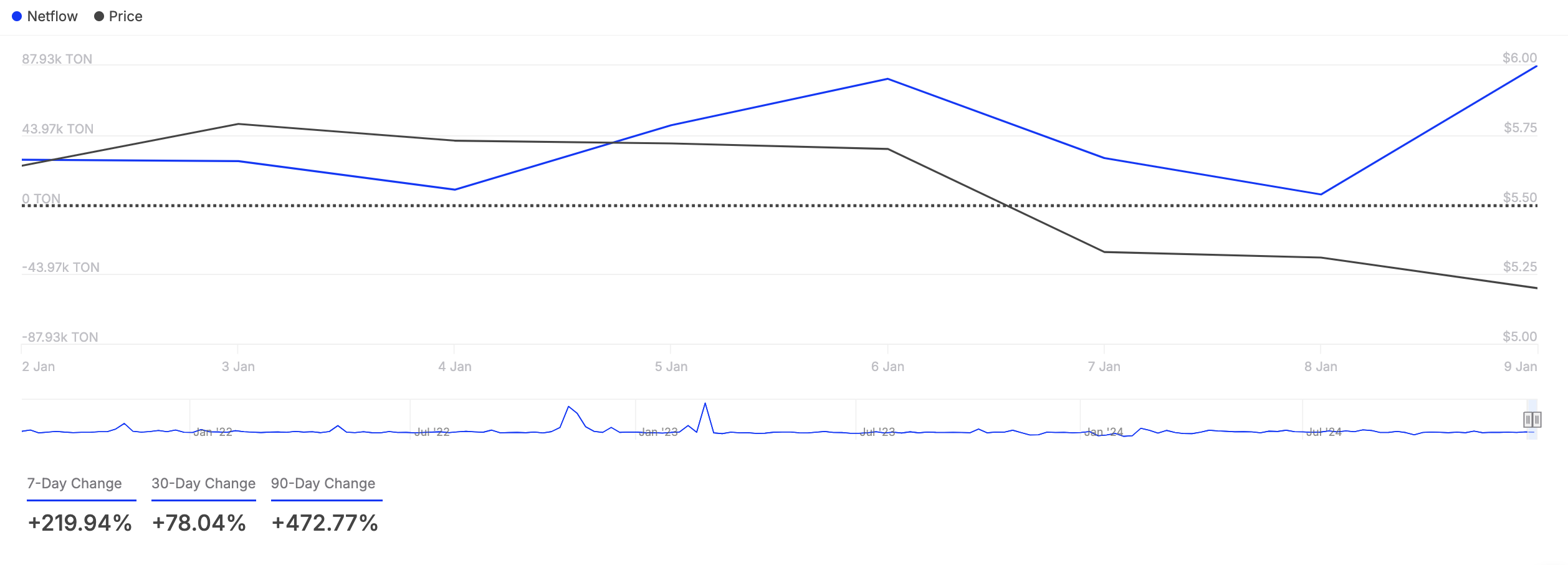 テレグラム関連のトンコイン(TON)は、今週クジラが購入したアルトコインの一つです。大口保有者のネットフローの急増がこれを確認しています。IntoTheBlockによれば、過去7日間で220%増加しました。