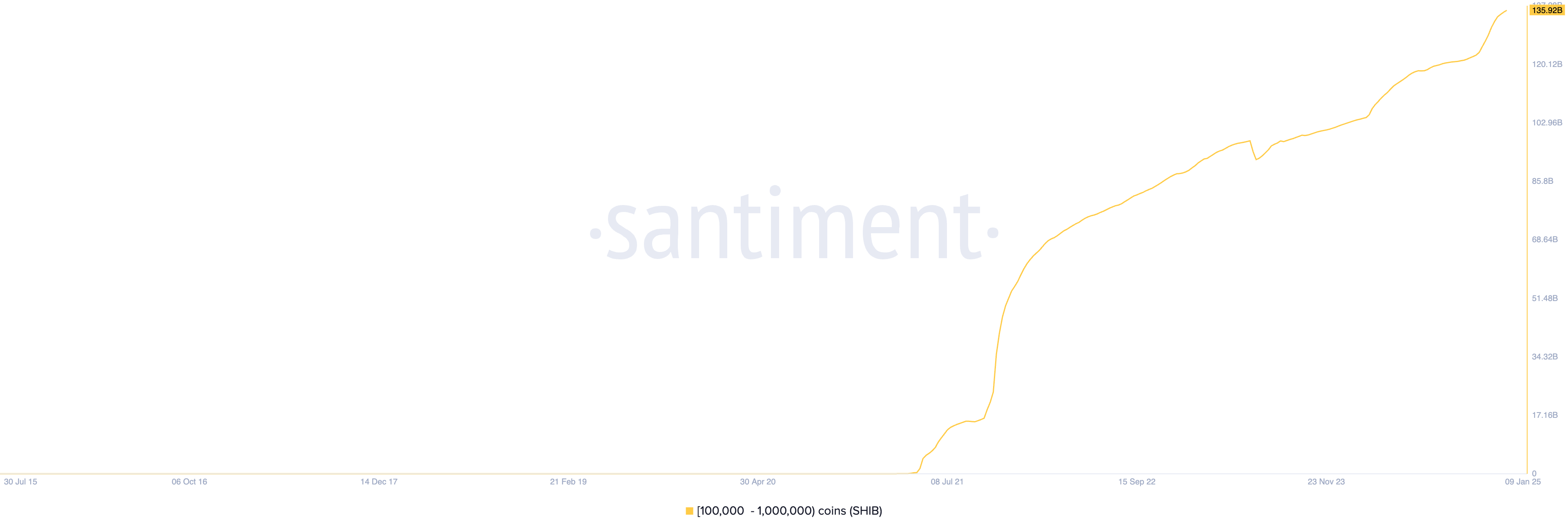 BeInCryptoのSHIBの供給分布の評価によれば、10万から100万SHIBを保有するクジラアドレスは、年初から19億4千万SHIBを追加で蓄積し、このグループのコイン保有量を1359億2千万コインの過去最高値に押し上げました。