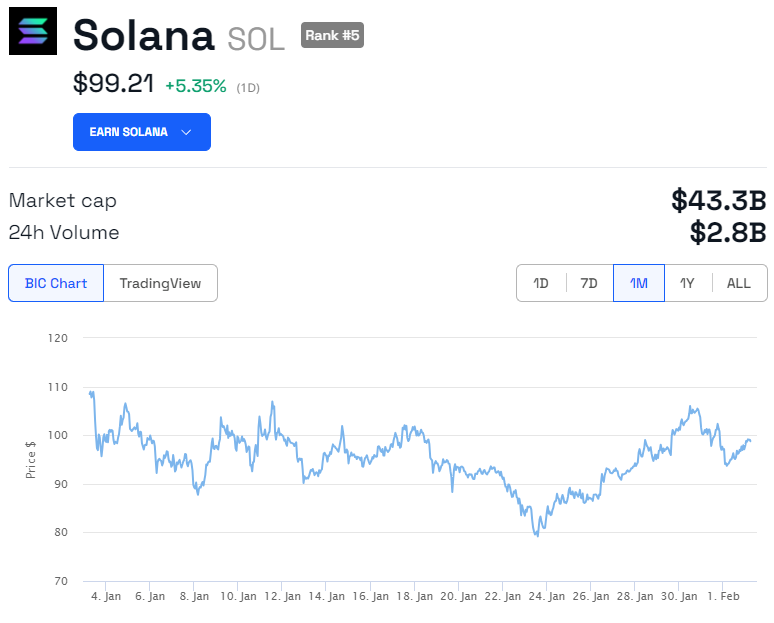 Solana (SOL)は、ブロックチェーントークンが再び100ドルに迫る中、5.3%上昇した。