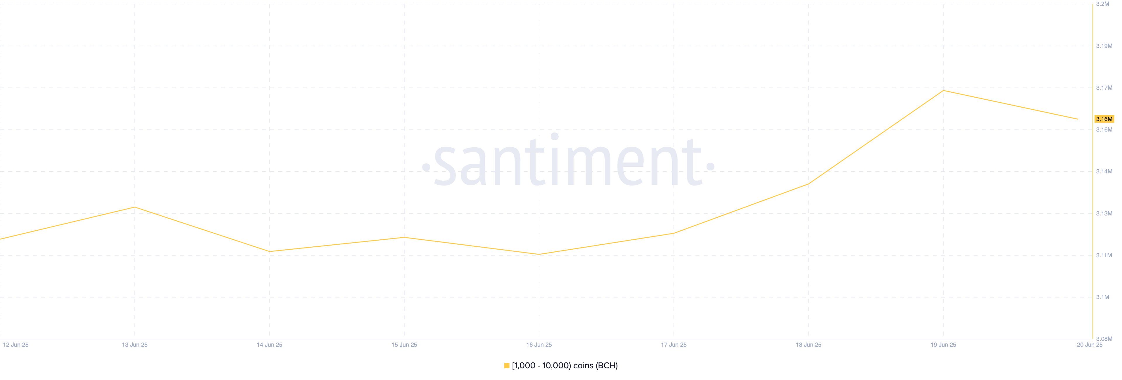 SponsoredSantimentのデータによれば、1000から1万BCHトークンを保有するウォレットアドレスのコイン保有量が増加している。今週のレビュー期間中、このBCH保有者のグループは、現在の市場価格で1900万ドル以上の価値がある4万トークンを取得した。