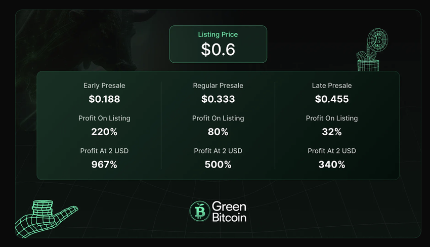 Green Bitcoinのプレセールは始まったばかりですが、優れたトークノミクス(トークンの経済・設計)により、このプラットフォームが長期的に50倍に成長する可能性があると投資家は信じており、すでに多くの投資家が参入しています。