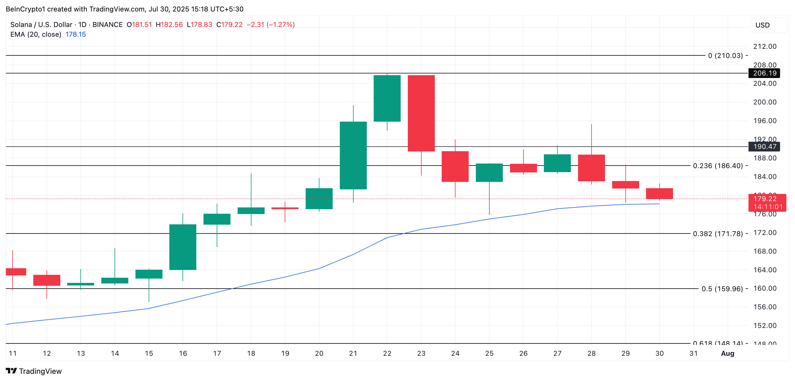 SOLの過去数日の下落は、その価格を20日間の指数移動平均(EMA)に危険なほど近づけており、178.25ドルで重要な動的サポートラインを形成している。参考までに、SOLは現在180.51ドルで取引されている。