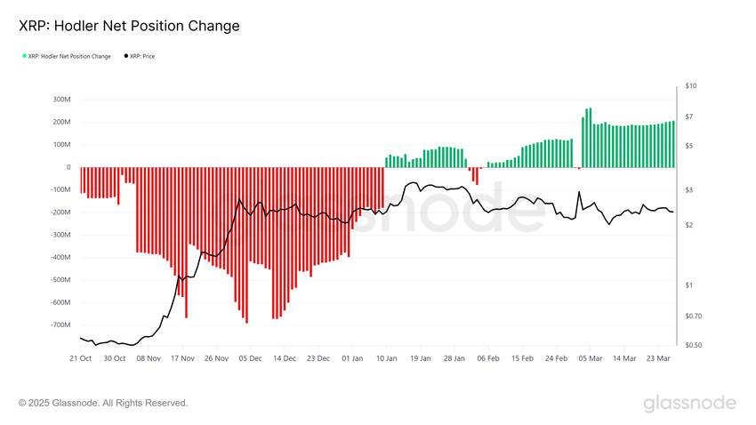 長期保有者の行動を追跡するHODLerポジションチェンジ指標は、LTH(長期保有者)がこの統合フェーズ中にXRPを蓄積していることを示している。この蓄積は、LTHがXRPが将来的な価格上昇を活用することを確信していることを示唆している。