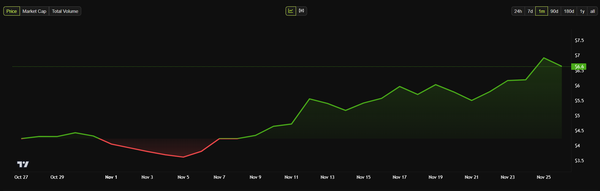 NEARは、CoinGeckoによると、時価総額で最大のAIトークンである。トークンは今年を通じて強い勢いを持ち、1月以来約250%上昇している。