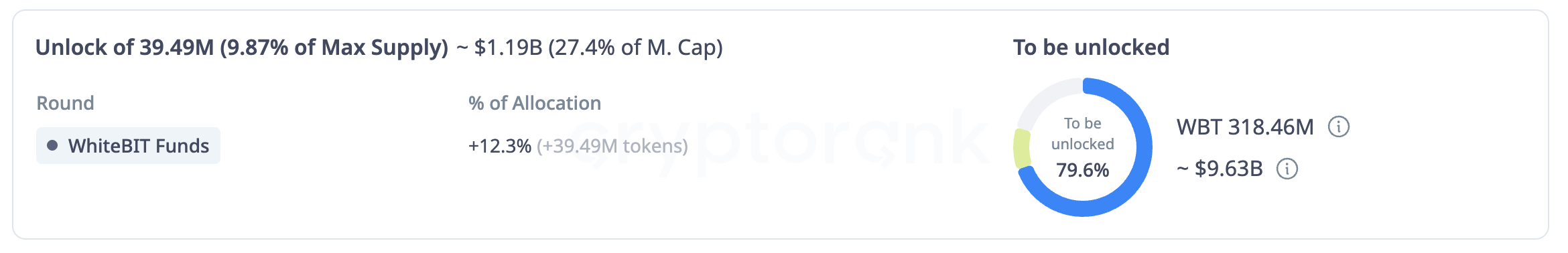 WhiteBIT(WBT)は13日、約39万トークンを解除し、約11億9000万ドルの価値となった。