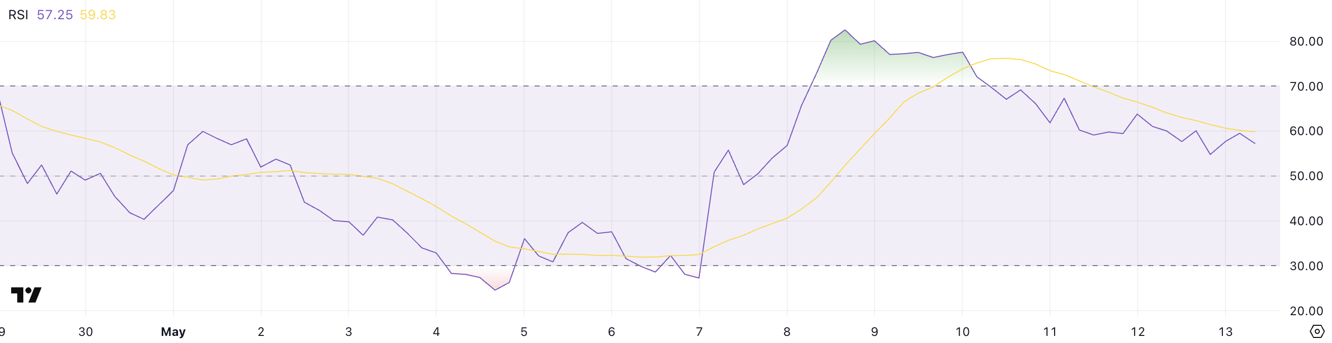 WhiteBITのRSIは、5月8日から5月10日まで70を超えていた後、77.57の最近の高値から57.25に低下した。これはトークン解除直前の勢いの冷却を示している。