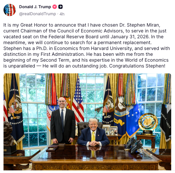 トランプ米大統領は7日、経済諮問委員会(CEA)議長のスティーブン・ミラン氏を連邦準備制度理事会(FRB)の理事に指名した。暗号資産に積極的な姿勢を示す経済学者で、アドリアナ・クグラー氏の後任として2026年1月までの任期を務める見通しだ。市場では、低金利とデジタル資産に配慮した金融政策への転換を促す可能性があるとの見方が広がっている。