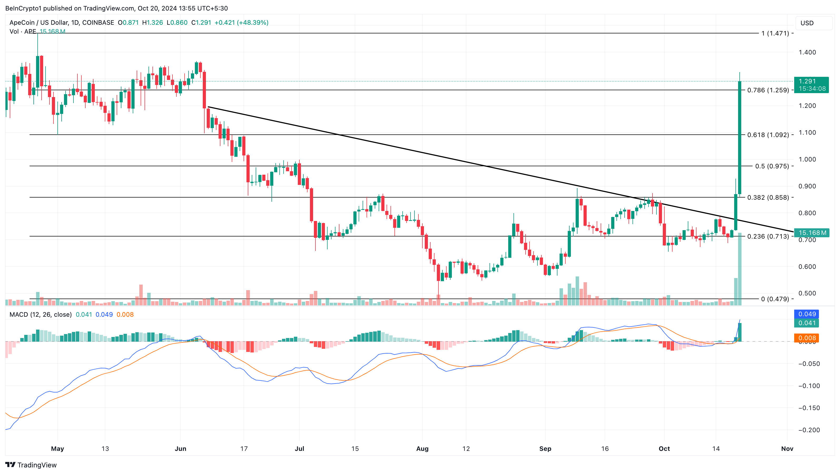 技術的な観点から、ApeCoinの価格は6月以来存在していた下降トレンドラインを突破した後、驚異的な成長を記録した。この下降トレンドラインは、長期間にわたり0.55ドルから0.85ドルの間で揺れ動く中、アルトコインが上昇するのを難しくしていた。とされている。