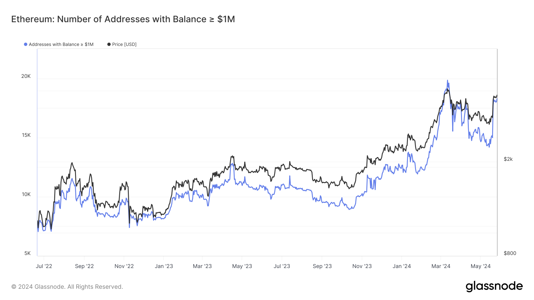 少なくとも100万ドルのETHを保有するアドレス数の増加は、機関投資家が積極的にイーサリアムを購入していることを強く示している。この傾向は、これらの大口保有者の間でイーサリアムの将来性に対する信頼が高まっていることに起因している。SECがスポットETFを承認したことは、機関投資家に規制された魅力的な投資手段を提供し、この発展に大きな役割を果たしたと考えられる。