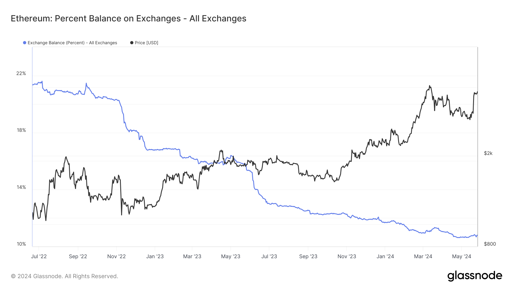 取引所で保有されているイーサリアムの割合は劇的に減少し、2024年5月には11%を下回っています。この傾向は、長期保管とステーキングへの大幅なシフトを示し、取引と売り圧力に利用可能な即時供給が減少しています。