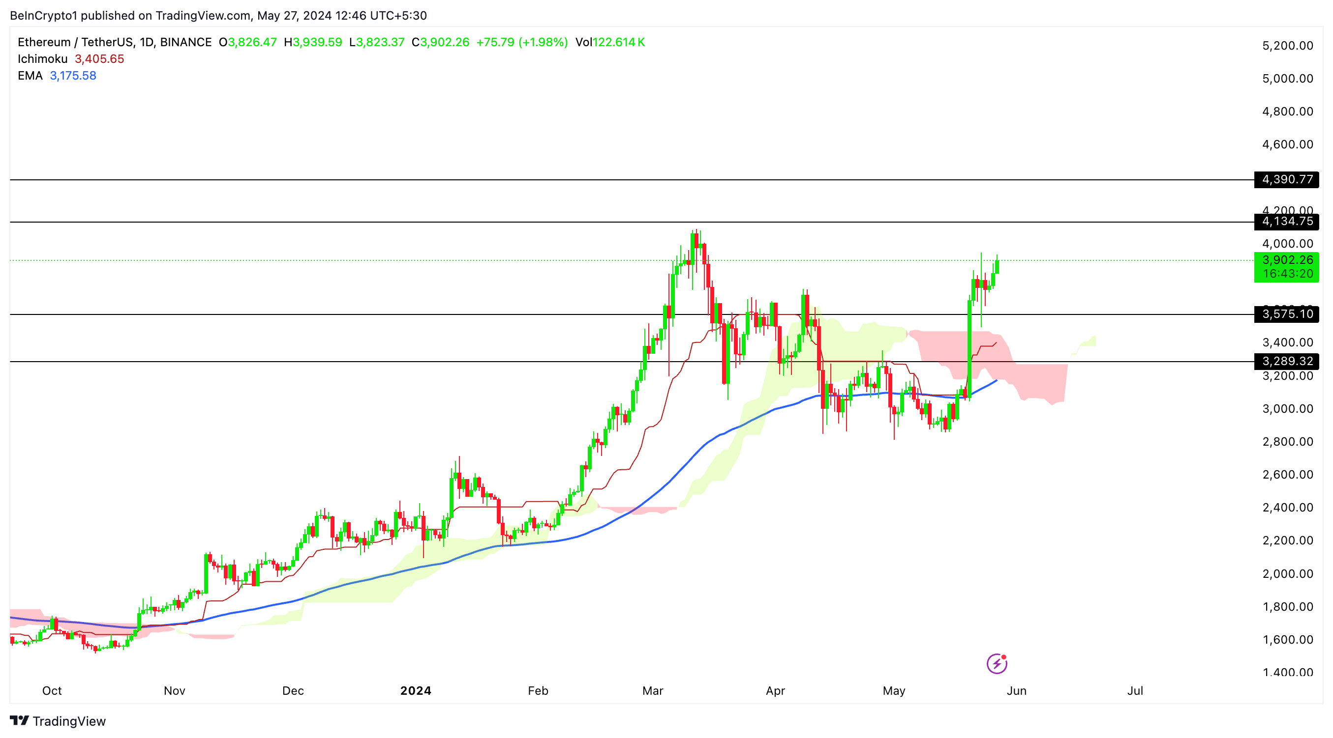 イーサリアム(ETH)は現在3,902ドルで取引されており、強気の勢いを示している。価格は一目均衡表の雲と100日EMA(現在3,175ドル)を大きく上回っており、上昇圧力が持続していることを示している。