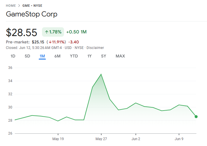 発表後、ゲームストップの株価(GME)は6%下落し、30ドル以上から28.50ドルに落ちた。5月28日、ゲームストップがビットコイン取得を明らかにした日の価格から、株価は20%下落した。
