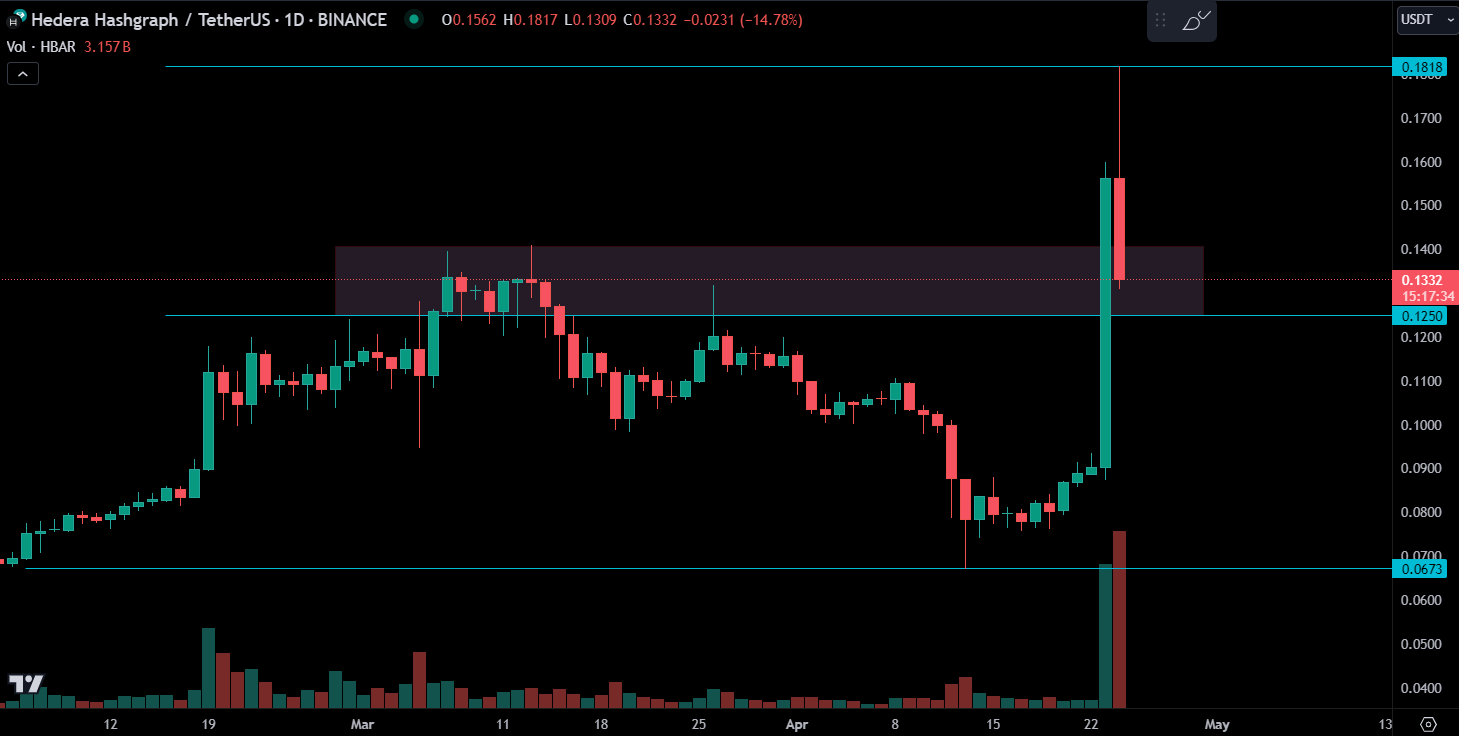 発表後、HBARの価格は100%上昇した。HBARは2年ぶりの高値となる0.18ドルをつけた後、価格が調整し始めた。現在、57%の値上がりとなっている。