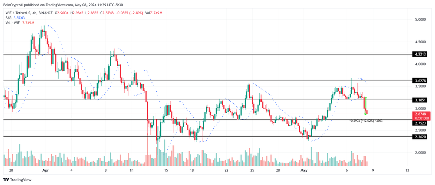 Dogwifhat(WIF)価格は、過去24時間で、3.18ドルのサポートレベルを下回り、12%の下落を記録した。これは、過去1日の市場の強気が弱まったためである。これにより、ミームコインは2.72ドルのサポートに向かう可能性がある。