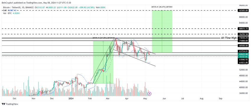 一方、ビットコインの価格が61,846ドルから跳ね返された場合、パターンからのブレイクアウトの可能性が観察される可能性がある。そうなれば、BTCは68,500ドル奪還への道を歩むことになる。
