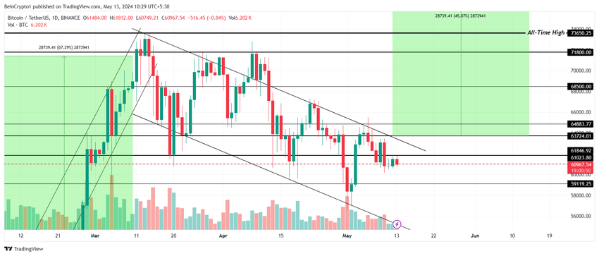 ビットコイン価格は61,000ドル前後で推移しており、これは何日も重要なサポートレベルとなっている。過去24時間にわずかな下落が見られたものの、暗号資産が下落トレンドから抜け出し、サポートとして63,700ドルを確保すれば、BTCはまだ回復の可能性がある。