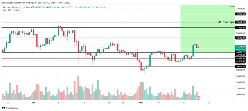 ビットコインの価格は今週、より広範な市場の合図に従って66,000ドルまで上昇した。小幅な調整後、BTCは現在65,500ドルで取引されており、重要な心理的サポートである65,000ドルより上で推移する可能性が高い。