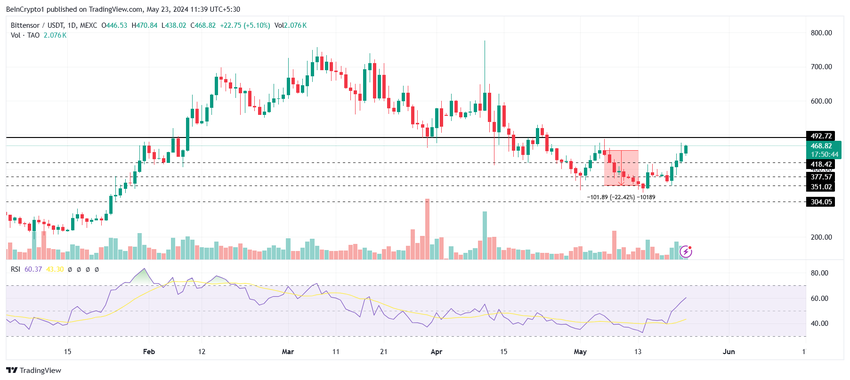 BittensorのネイティブトークンであるTAOは、3日間で30%上昇した後、468ドルで取引されている。この上昇はTAOを500ドルのレジスタンスに向かって押し上げている。
