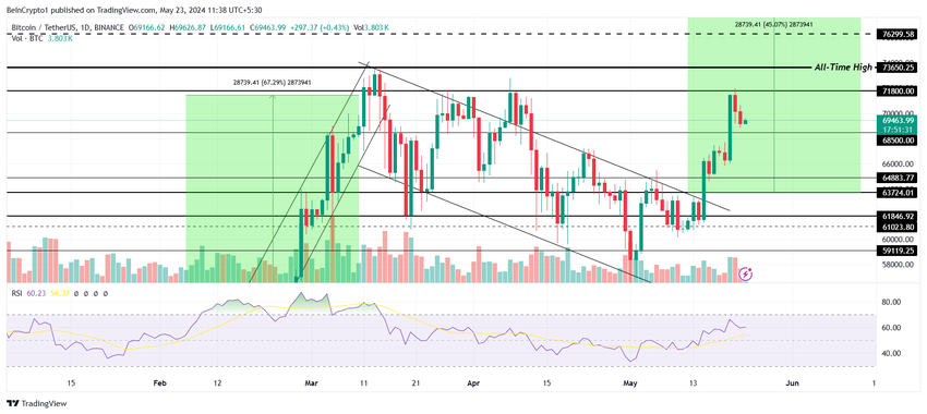 ビットコインの価格は、71,800ドルの障壁を突破できなかった後、現在69,500ドルで取引されている。BTCは現在、68,500ドルの重要なサポートに注目しており、同レベルまで下落する可能性が高い。しかし、暗号通貨がこれを下回ることはないだろう。