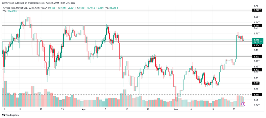 暗号資産市場の冷え込みが続く中、時価総額(TOTAL)は今のところ安定している。ビットコイン(BTC)の価格は、今後数回の取引セッションで若干の整理が見られるだろう。しかし、Bittensor DAOトークン(TAO)は上昇を続け、500ドル突破に近づいている。