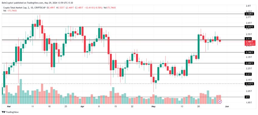 暗号資産時価総額(TOTAL)は、日中の高値圏では好調に推移したが、直後に下落した。ビットコイン(BTC)も同様で、重要なサポートを下回っている。しかし、dogwifhat (WIF)は先のセンチメントを利用し、過去24時間で大幅な上昇を記録した。