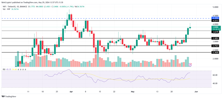 ミームコインは、4.2ドルのレジスタンスを突破しそうな勢いである。サポートに反転した場合、このレベルはWIF価格が4.8ドルを超える新たなATHを描くことを可能にする可能性がある。