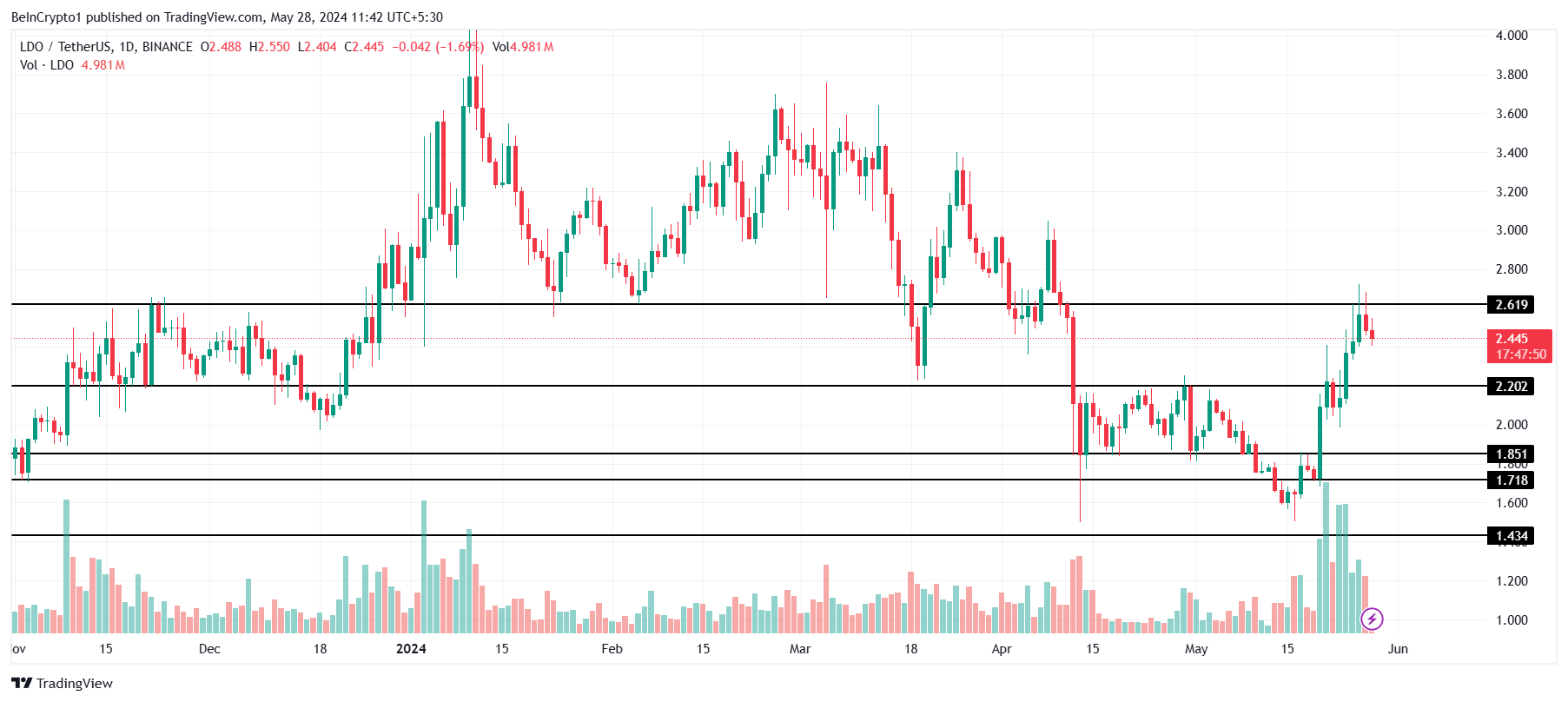 Lido DAOの価格は5月後半に大幅に上昇したが、最後の24時間は異なっていた。LDOが2.6ドルの重要なレジスタンス突破に近づくにつれ、市場の風向きは強気から弱気に変わった。その結果、リドDAOは突破に失敗し、2.4ドルまで下落した。
